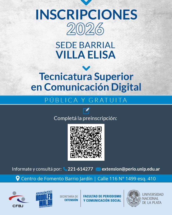 La posibilidad de estudiar una carrera universitaria sin salir de Villa Elisa ya es una realidad. La Facultad de Periodismo y Comunicación Social de la Universidad Nacional de La Plata (UNLP) ya lanzó las inscripciones para sumarse a la Tecnicatura Superior Universitaria en Comunicación Digital en el Centro de Fomento Barrio Jardín.